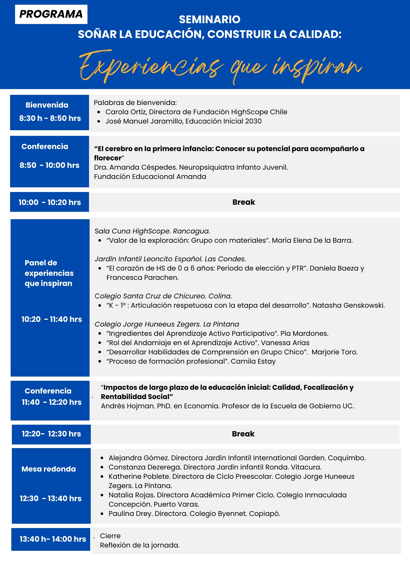•  "Impactos a largo plazo de la educación inicial: Calidad, Focalización y Rentabilidad Social”.  Andrés Hojman, PhD. en Economía, Profesor de la Escuela de Gobierno UC.